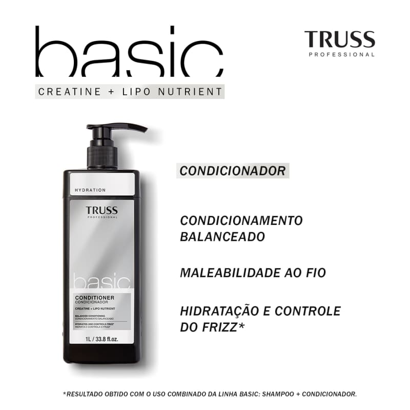 O Condicionador Basic TRUSS 1L é indicado para as mais diversas necessidades do dia a dia do salão. Com os ativos Creatine + Lipo Nutrient, auxilia na preparação ideal para procedimentos profissionais, como corte, escova, penteado e lavagem simples. Além disso o condicionador promove:*